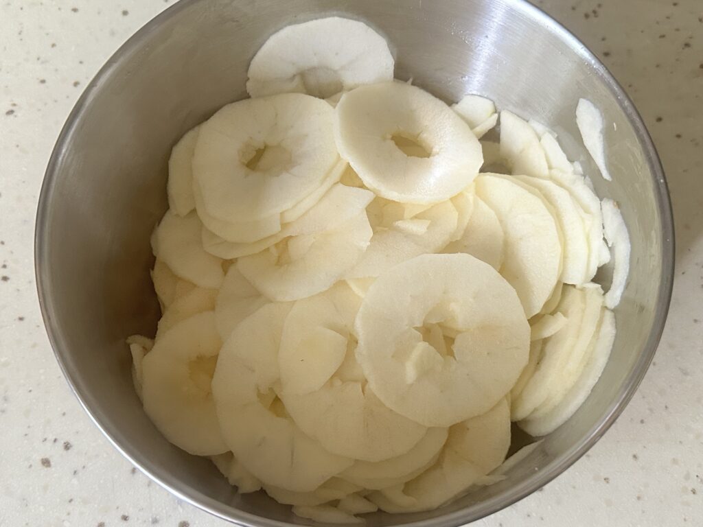Táo gọt vỏ, bỏ hột, cắt lát mỏng, càng mỏng càng tốt. Có bàn bào sẽ tiện hơn rất nhiều.