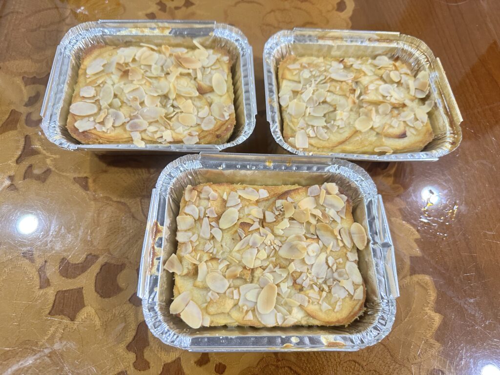 Xếp sao cho các lớp táo càng bằng phẳng càng tốt. Cuối cùng rắc hạnh nhân lát lên trên mặt. Với số nguyên liệu trên mình làm được ba khuôn nhôm như hình, loại 8 x 13 x 4cm gì đó.